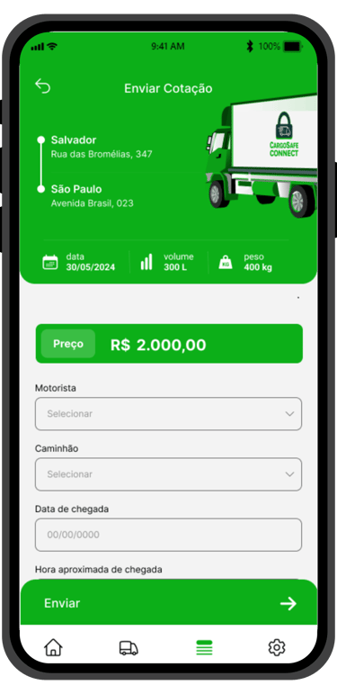 A Cargo Safe Connect oferece a tranquilidade de contratar motoristas rápidos, validados e em conformidade com a lei. A flexibilidade é garantida, permitindo a escolha do dia, horário e motorista que vai realizar a viagem, graças ao nosso sistema logístico inteligente que conecta motoristas próximos ao local de retirada da carga. E o melhor de tudo: as entregas são garantidas no prazo, com acompanhamento em tempo real e segurança total graças a nossa ferramenta que permite que a transportadora acione o botão de pânico em caso de emergência ou acompanhe os alertar temporários de cada caminhão.